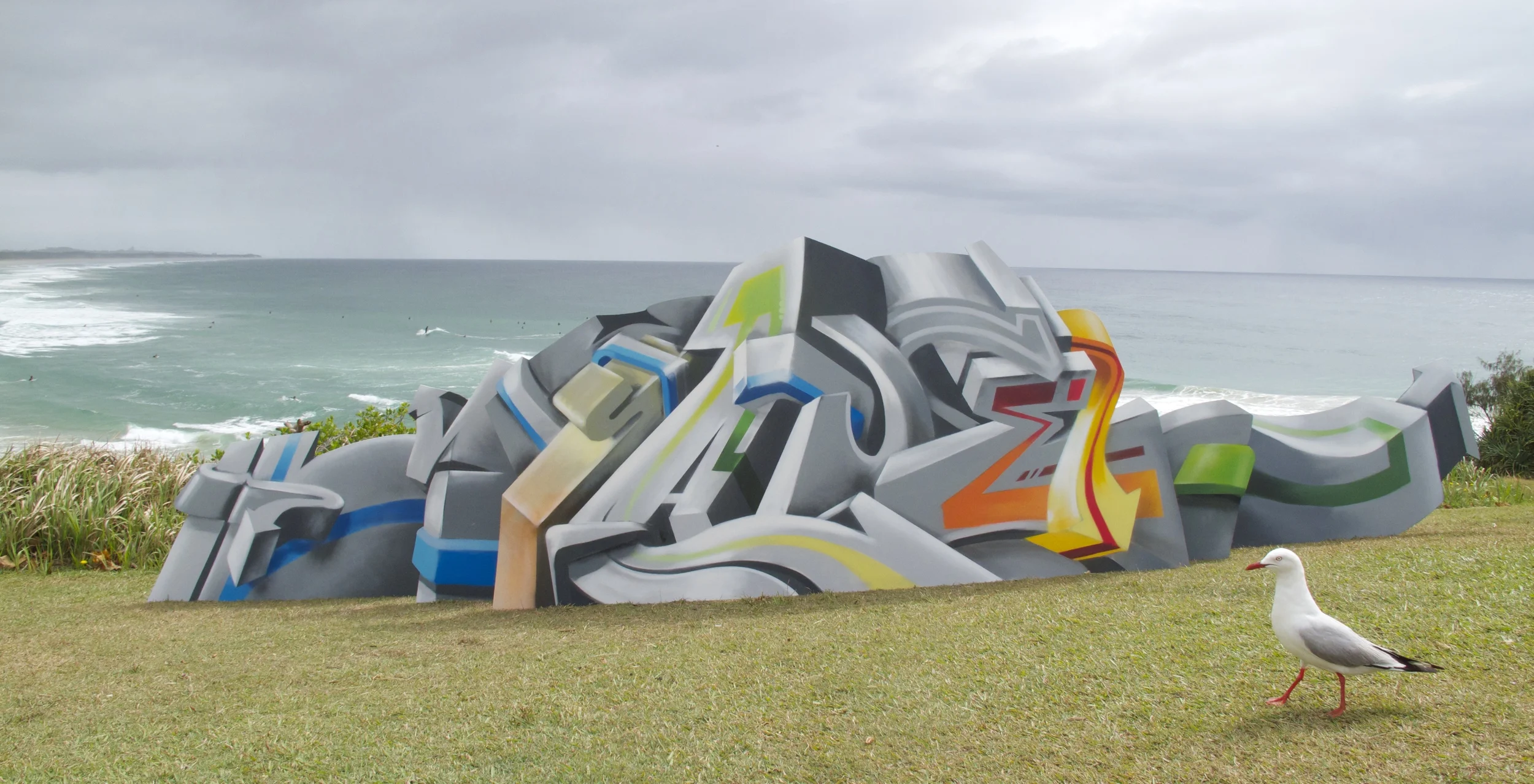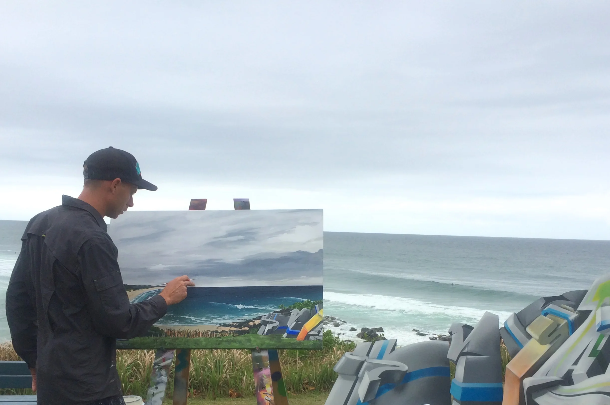 The day was overcast, and we even had to contend with some light showers, but that didn't stop the people from flooding into the headland, or Sauce creating a plein air version of his installation. Installation work is where Sauce is keen to keep pushing the boundaries and experimenting with. For this work, he used aerosol on a composite board, creating a three dimensional effect to contrast with the natural landscape.