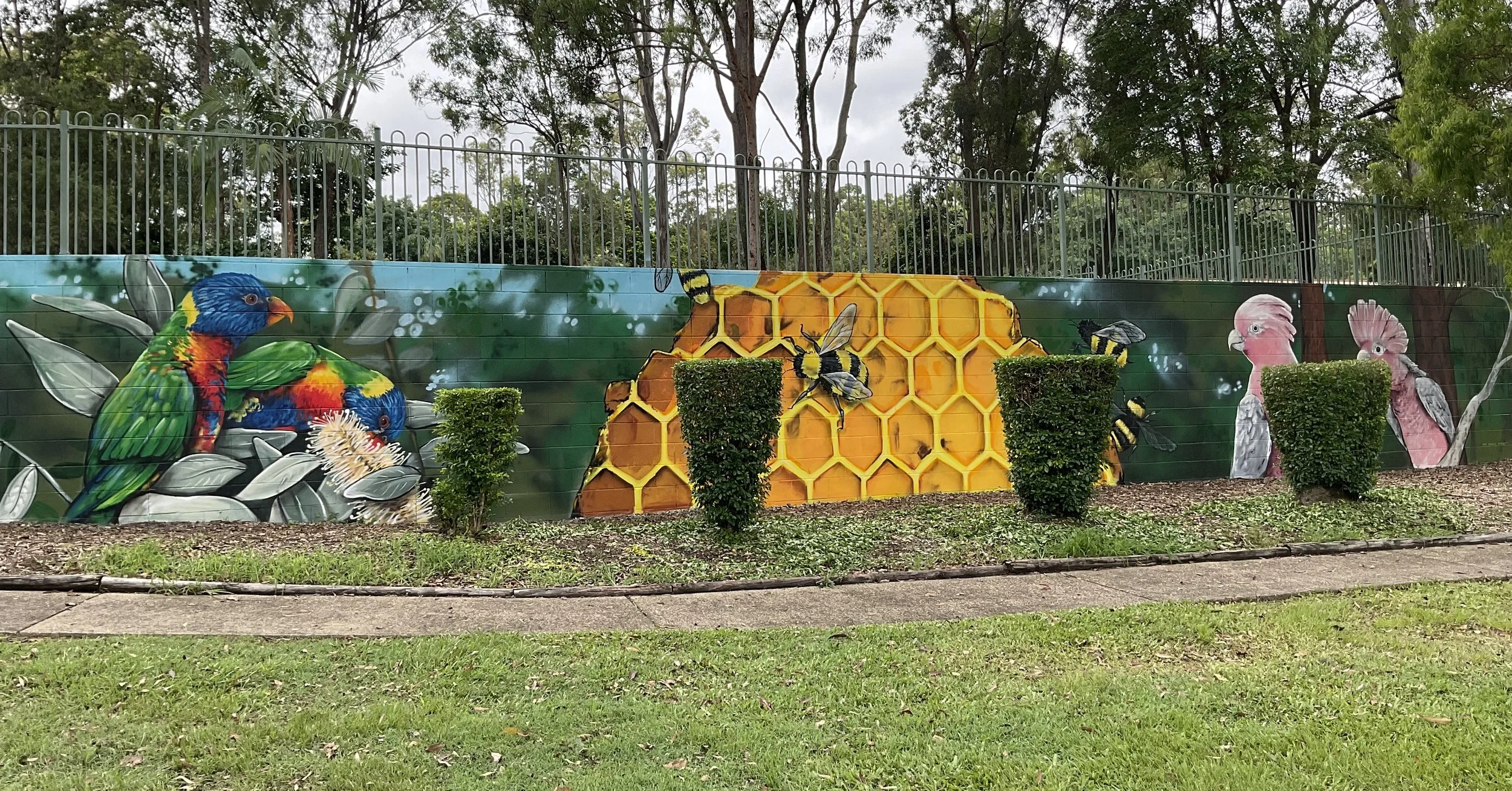 /I enjoyed kicking off the new year with a large scale work at Oxenford State School. The P&C provided the opportunity to paint a native flora & fauna mural which serves as a colourful welcoming statement. I packed in lots of details along the 50m long wall and included some of the animals that were hanging about whilst painting such as bees, spiders, magpies and the resident blue tongue lizard “Bluey”. The feedback has been amazing, from staff, students, OHSC, parents, other contractors, local politicians and residents many of whom have voiced positive comments whilst driving past or stopping to take a closer look and check out the art making process and progress.