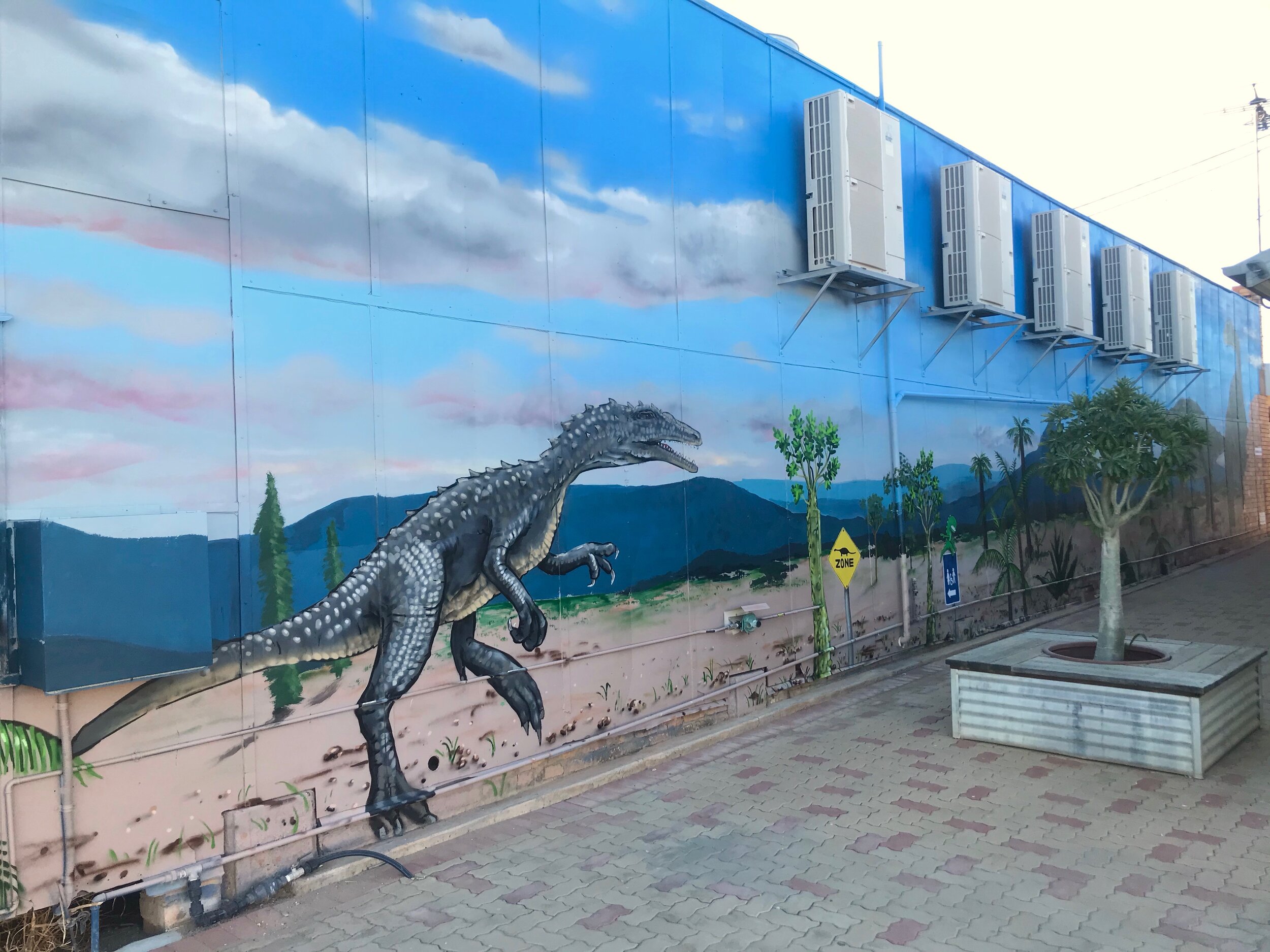 Winton is the dinosaur capitol of Australia so a dinosaur mural was a good fit for the laneway between the library and bakery. This theme also referenced previous work on this site by Bill O’Brien who’s hand painted signs I have admired for many years. Incorporating the existing bricks into the artwork created a lot of interest and invited passers by to take a closer look. The large wall demanded decent sized features and I also managed to squeeze in smaller details to create points of interest along the laneway.